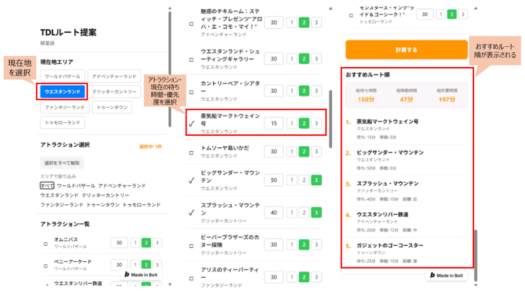 今回は東京ディズニーランドを例にアトラクションをどの順にまわると時間をかけずに済むのかわかるアプリを作ってみました。自分が今いる現在地エリアを選択し、そこからまわる予定のアトラクションを選択、その時の待ち時間(分)と優先度(1、2、3)も選択します。計算するボタンを押下するとおすすめルート順が表示されるといった仕様です。